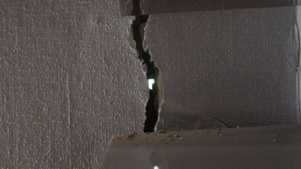 «Я приехала с моря в понедельник и уже в подъезде увидела, что начали появляться маленькие трещинки. У меня даже дверь перестала нормально открываться, ее перекосило. Через день-два трещины расширились. В четверг прихожу домой и вижу эти огромные трещины, сегодня – уже и потолок начал обваливаться, – рассказывает жительница квартиры Влада Макушина. – За день трещины выросли с 9 миллиметров до почти 4 сантиметров!».