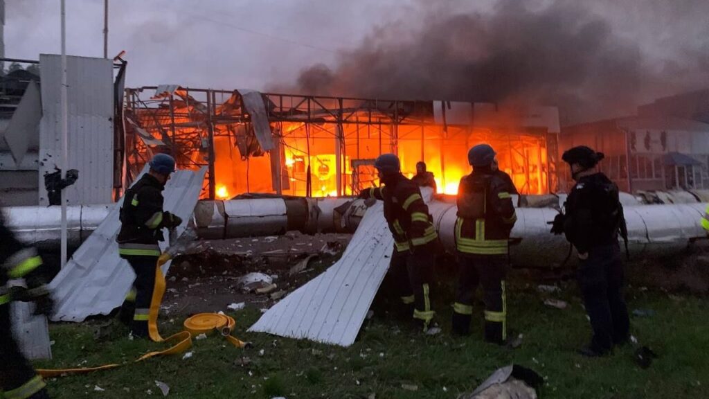 На одному з місць ракетного удару – у будівлі автосалону – сталася пожежа. Рятувальники ДСНС ліквідували загоряння на площі 100 квадратних метрів. На місці події співробітники Служби порятунку виявили тіло загиблої людини.