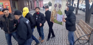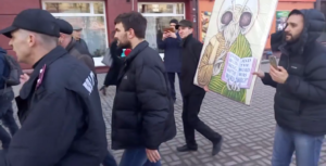 Сегодня, 5 марта, в Запорожье состоялся крестный ход с православной святыней – иконой с частицей Креста, на котором был распят Святой Апостол Андрей Первозванный. В шествии приняли участие десятки верующих. Параллельно с этим несколько запорожцев решили провести свое мини-шествие с квазирелигиозным персонажем.
