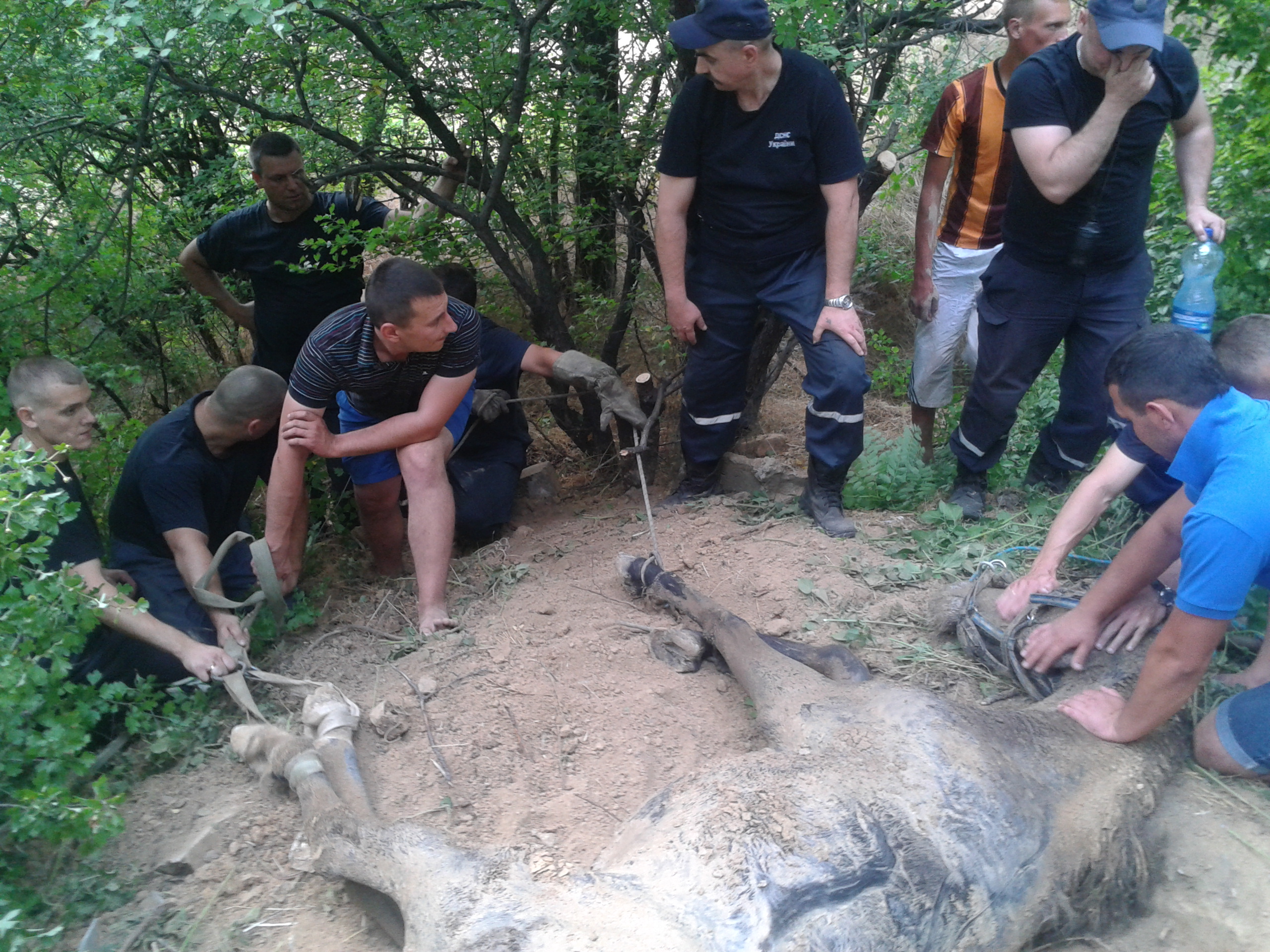 Спасатели раскопали яму, с помощью спасательных веревок и пожарных рукавов животное вытащили на поверхность и передали владелице, сообщает пресс-служба ГУ ГСЧС в Запорожской области.