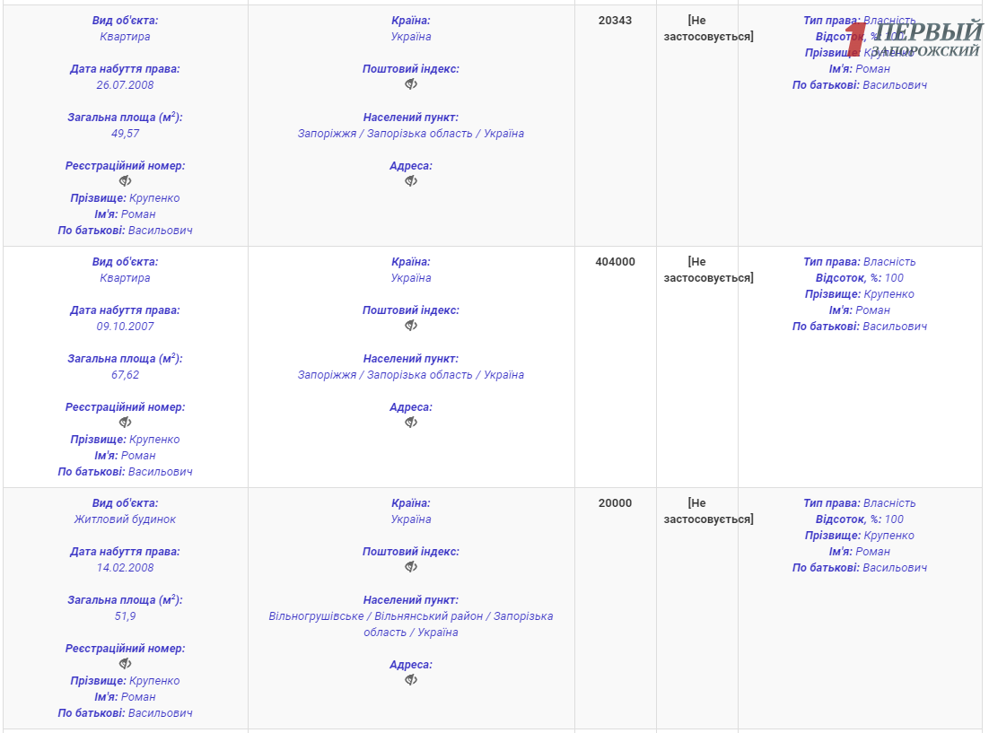 Собственного автомобиля у чиновника нет. Из недвижимости на Романа Васильевича записано две квартиры в Запорожье на 49,5 квадратных метра и 67,6 квадратных метров стоимостью в 404 тысячи гривен, а также дом в Вольногрушевке Вольнянского района на 52 м2. Также в Вольнянском районе у Крупенко есть два земельных участка на 12 соток.