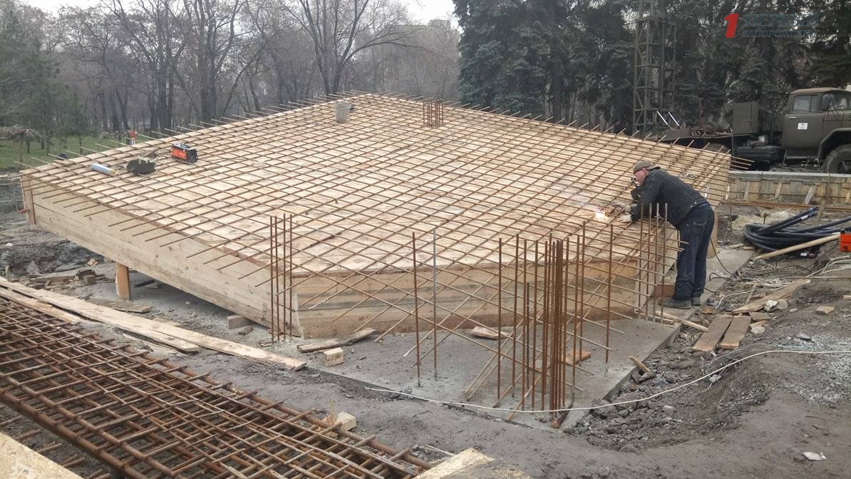 В настоящий момент на объекте работают десять строителей, которые трудятся над монтажом плит перекрытия. Металлические конструкции для основы памятника укладывают в двух направлениях и ведут подготовку над созданием так называемого «венца», который является основой, содержащей стержни арматуры. Финальным этапом станет заливка бетона, но, по словам подрядчика, при неблагоприятной погоде заливать бетон нельзя, а значит работы будут на время приостановлены.