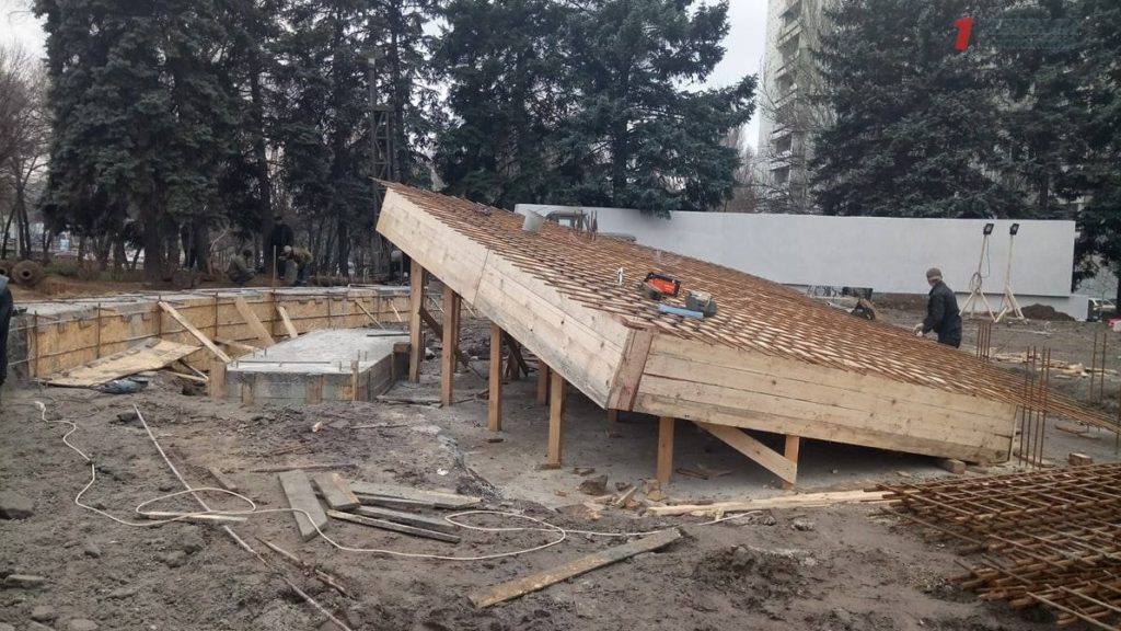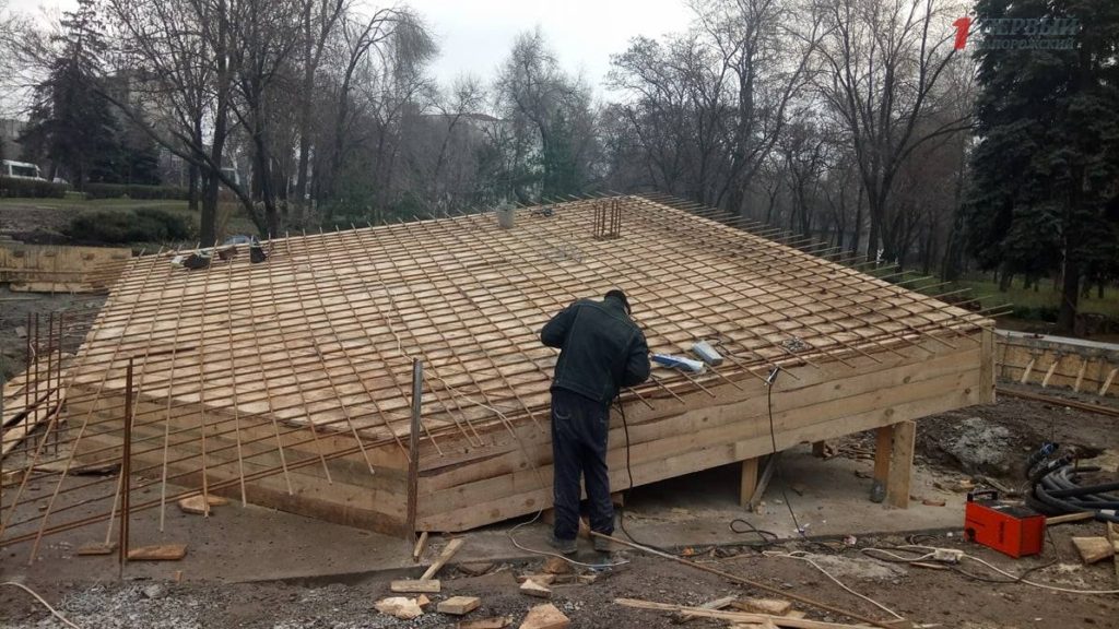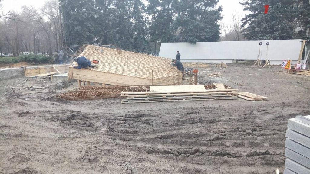 В настоящий момент на объекте работают десять строителей, которые трудятся над монтажом плит перекрытия. Металлические конструкции для основы памятника укладывают в двух направлениях и ведут подготовку над созданием так называемого «венца», который является основой, содержащей стержни арматуры. Финальным этапом станет заливка бетона, но, по словам подрядчика, при неблагоприятной погоде заливать бетон нельзя, а значит работы будут на время приостановлены.