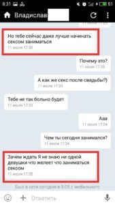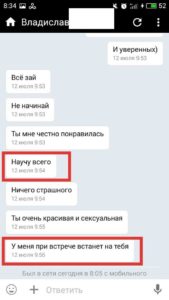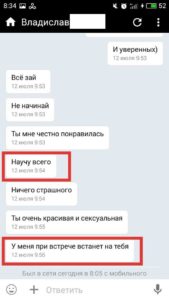 На этот раз на «на горячем» попался 19-летний житель села Смелое Бильмацкого района. Владислав учится в ЗНТУ на юриста и встречается с девушкой. На каникулах он подрабатывает на стройке, а в свободное время переписывается в социальных сетях с девушками. В ходе такого онлайн-общения Владислав познакомился с 13-летней девочкой (фейковая страница). Студент вызвался научить школьницу интиму, присылал фотографии порнографического содержания. Парень поведал, что желал интима, потому что ему понравилась девочка.