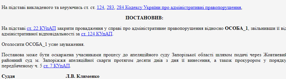 Жовтневый районный суд Запорожья приняв во внимание все обстоятельства дела, вынес вердикт не применять административное наказание к женщине, а ограничился устным предупреждением.