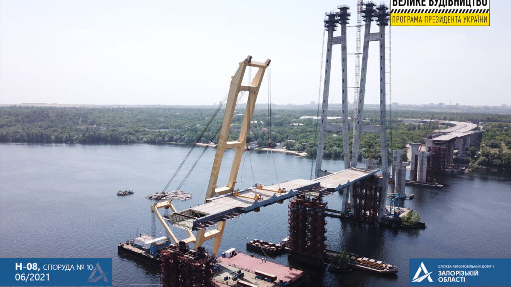 Чтобы смонтировать верховую ветку моста с левого берега на Хортицу протяженностью 660 метров, необходимо смонтировать 6 секций весом около 700 тонн каждая и протяженностью около 80 метров. Затем их соберут воедино и закрепят ванты. Только после этого начнут убирать временные опоры. По прогнозам Службы автодорог, все секции будут установлены и смонтированы в течение 40-45 дней.