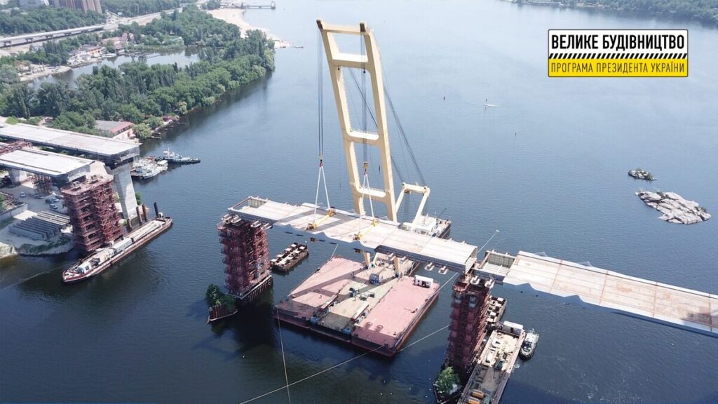 Чтобы смонтировать верховую ветку моста с левого берега на Хортицу протяженностью 660 метров, необходимо смонтировать 6 секций весом около 700 тонн каждая и протяженностью около 80 метров. Затем их соберут воедино и закрепят ванты. Только после этого начнут убирать временные опоры. По прогнозам Службы автодорог, все секции будут установлены и смонтированы в течение 40-45 дней.