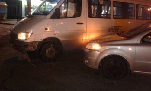 Легковой автомобиль Chevrolet “въехал” в маршрутку №85. Авария произошла по винe водителя легковушки, который не посмотрел по сторонам и начал поворачивать на улицy Святого Николая. В результате машины столкнулись.