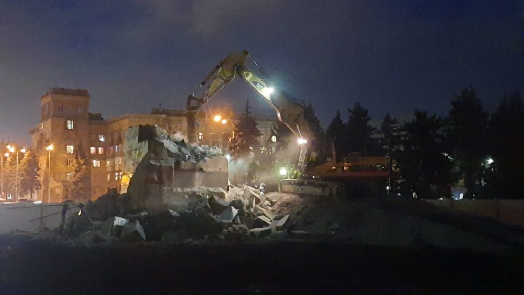 Вчера демонтаж постамента с помощью гидромолота продолжался весь день и продолжался после 18 часов.