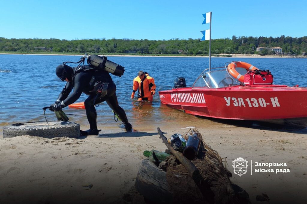 У Запоріжжі водолази обстежують дно Дніпра на міських пляжах: з води витягують пляшки, пакети та колеса, — ФОТО