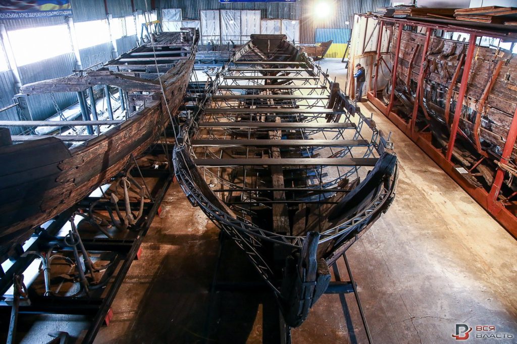 Как рассказал руководитель реставрационных работ, заведующий отделом охраны памятников и археологии Дмитрий Кобалия, грант позволил восстановить грузовой байдак, который вымыло на берег Десны и дуббель-шлюпку периода российско-турецкой войны 1737 года, поднятую со дна Днепра в районе Хортицы.