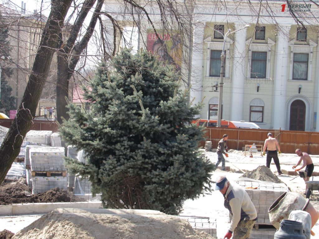 Высота между верхней и нижней частью сквера Театрального, от проспекта Соборного до ул. Александровской, составляет порядка пяти метров. Предполагается, что сквер будет четырехуровневым, со своеобразными террасами. В будущем здесь будет выполнено озеленение, уложены рулонные газоны и плитка,