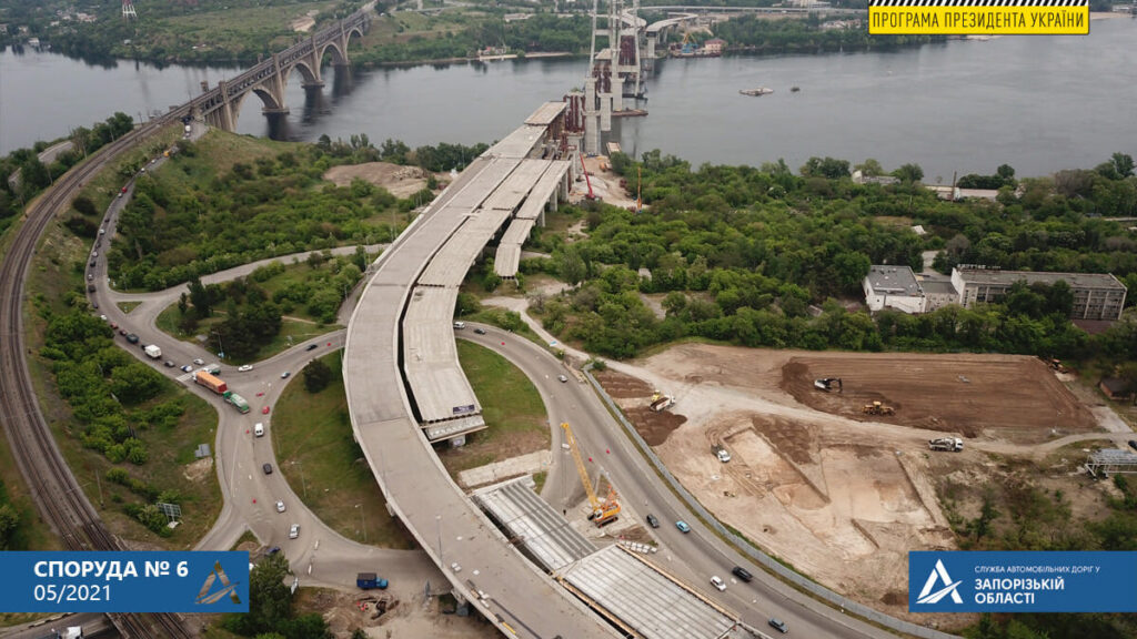 На підході до вантового мосту з боку острова Хортиця (споруда № 9н) наразі ведуться роботи з монтажу чотирьох тимчасових опор. Також на споруді мостобудівники змонтували 5 монтажних блоків коробчастої балки прогонової будови.