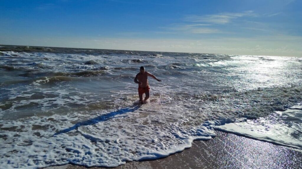Гостя з Дніпра звуть Єгор Гапон і він спеціально приїхав до Кирилівки, щоб здійснити свою давню мрію – викупатися в Азовському морі взимку.