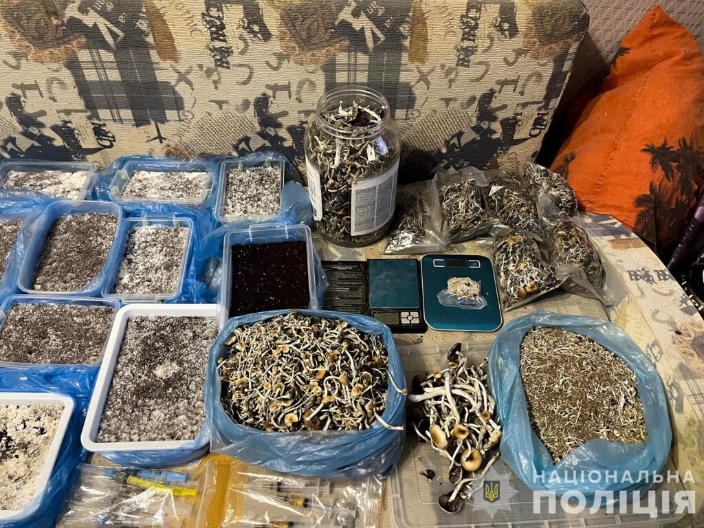 11 липня під час обшуків вилучили розфасовані гриби вагою близько 6 кілограмів, 23 ємності та 20 контейнерів, в яких вирощуються психотропні речовини, 310 грамів канабісу, 13 медичних шприців з прозорою рідиною, мобільні телефони, банківські картки, транспортний засіб, електронні ваги, паспорти з ознаками підробки, а також 8380 доларів та 80 000 гривень, ймовірно, здобуті злочинним шляхом. Все направили на експертизу.