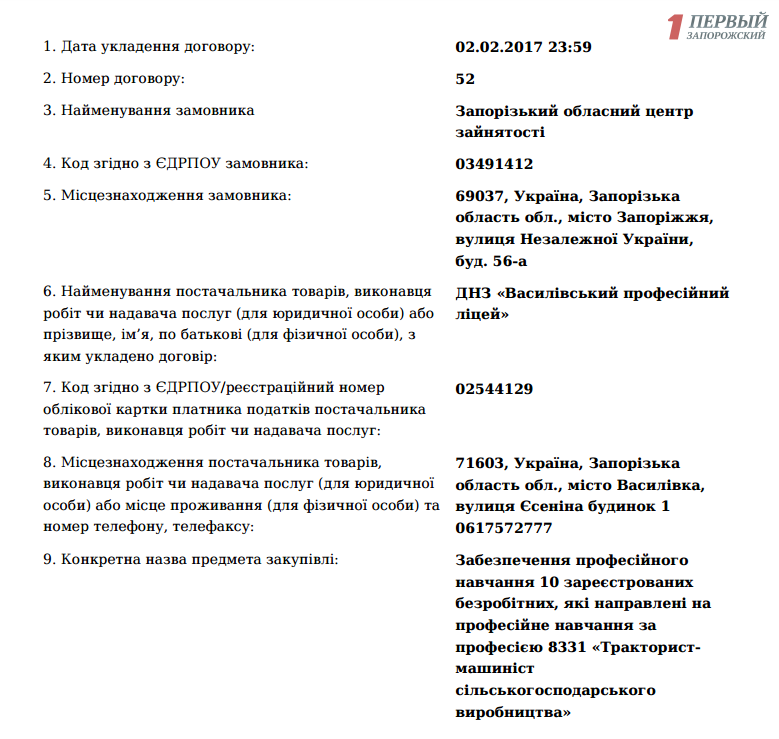 Так, вчера, 2 февраля, Запорожский областной центр занятости заключил договор на обеспечении профессионального обучения десяти безработных по специальности «тракторист-машинист сельхоз производства». Стоимость обучения составила 78 тысяч 755 гривен. Так из одного безработного могут сделать тракториста за 7,8 тысяч гривен. Заниматься обучением будет государственное учебное заведение «Васильевский профессиональный лицей».