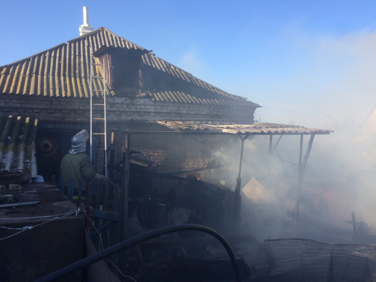 Прибыв на место пожара спасатели установили, что по указанному адресу горят две надворные постройки общей площадью 18 м2 и существует угроза опрокидывания огня на близко расположенный жилой дом. Поэтому работа спасателей проходила в двух направлениях: защита дома и тушение пожара.