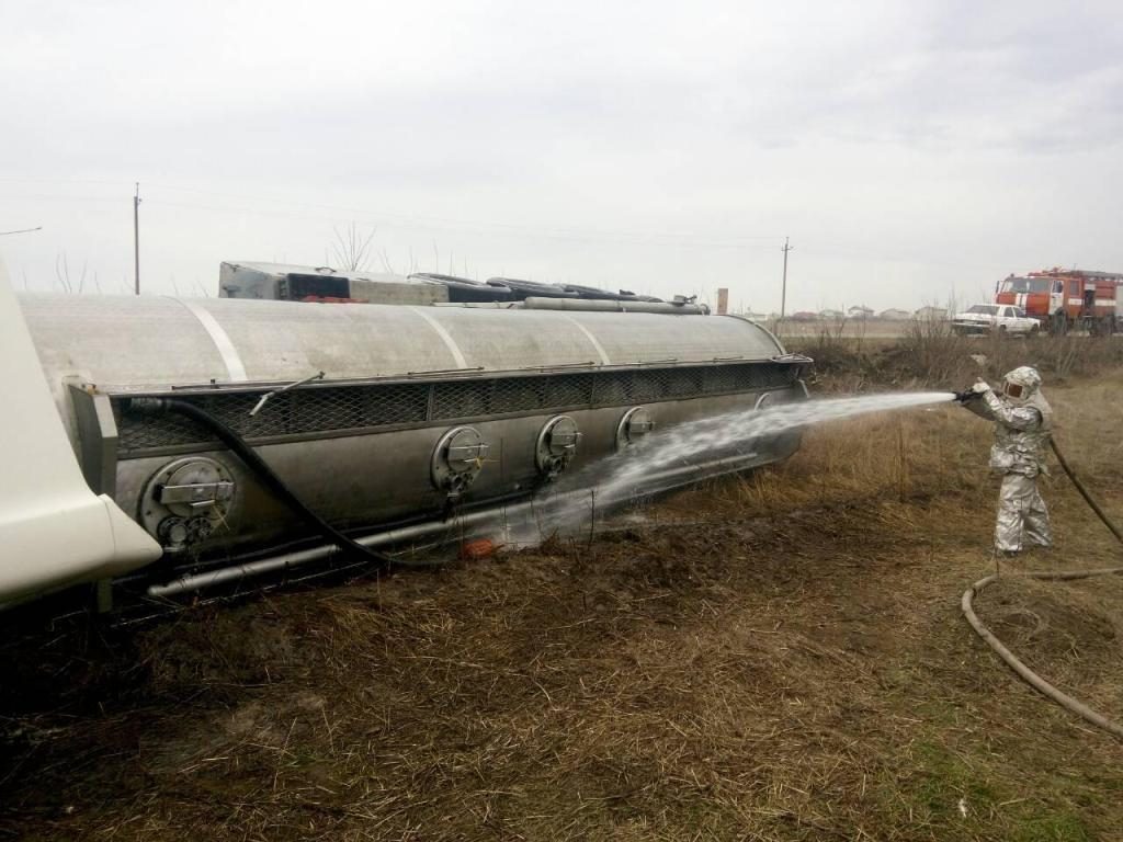 Спасатели провели охлаждение цистерны и покрытие разлитого топлива пенной подушкой.