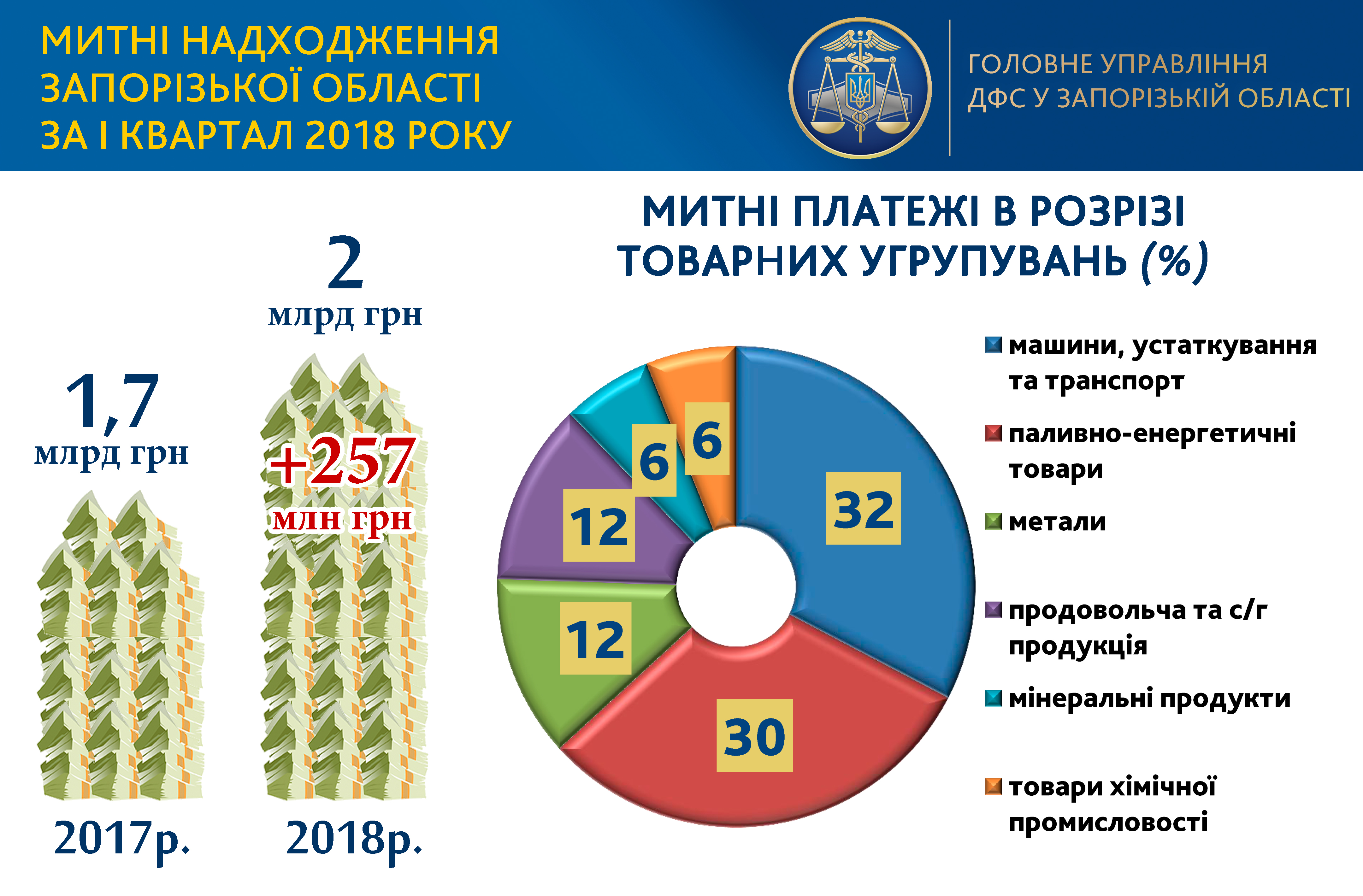 В первом квартале 2018 года предприятия, осуществляющие таможенное оформление в Запорожской таможне ГФС, уплатили в бюджет 1 миллиард 947,5 миллиона гривен. Это на 257,2 миллиона больше аналогичного периода 2017 года.