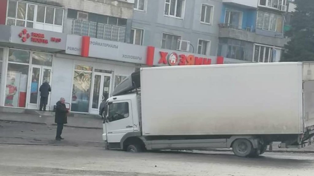 Вчора в Запоріжжі вантажний автомобіль прямо біля поштового відділення провалився під землю.