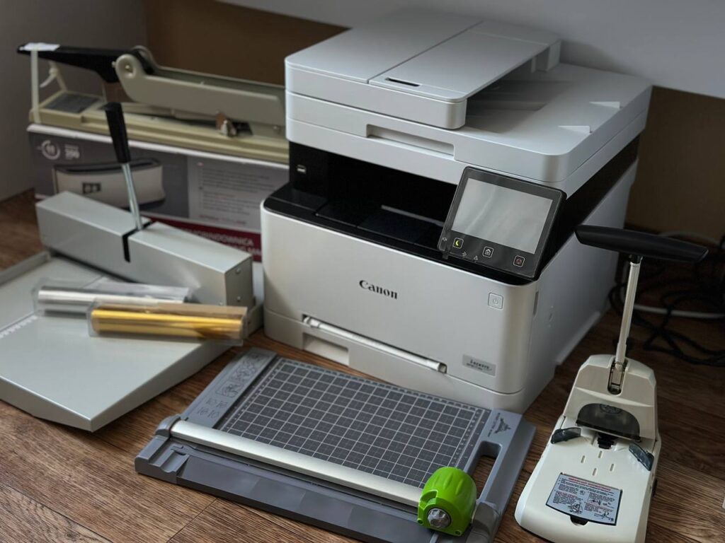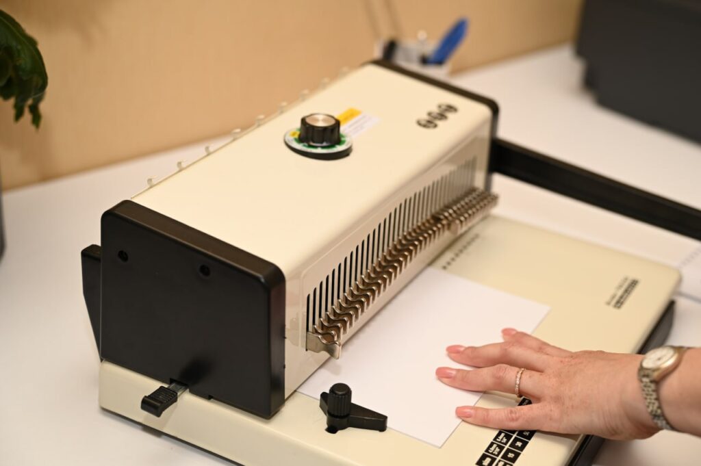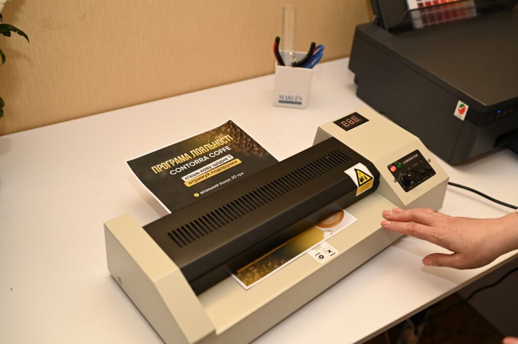 Кошти на обладнання Олена отримала в кінці серпня і використала їх на придбання лазерного принтера, який дозволяє швидко друкувати великі обсяги продукції (наприклад, блокноти за годину), а також створювати позолочені сертифікати. Додатково підприємниця купила станок для створення згинів для журналів, каталогів, а також перфорації квитків, потужний степлер, діркопробивач, заокруглювач кутів, менший різак (під формат А3), а також термобіндер для склеювання книг та каталогів (до 200 аркушів) та розхідні матеріали.