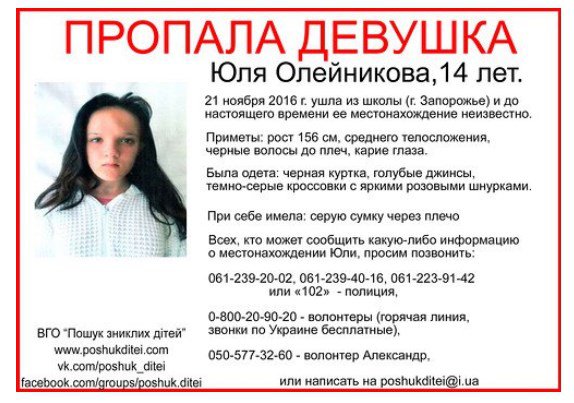 В последний раз юную запорожанку видeли 21 ноября. Примeты Юли: рост 156 см, среднего телосложения, черные волосы до плеч, карие глaза.