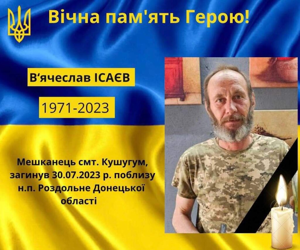 Під час виконання бойового завдання на Донеччині загинув В’ячеслав Ісаєв. Загиблому захиснику, родом із Кушугума, було 52 роки.