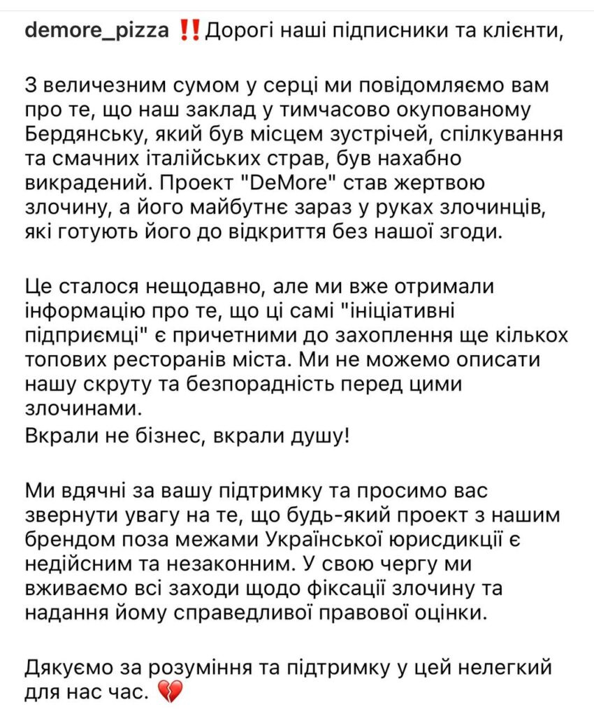 «Просимо вас звернути увагу на те, що будь-який проєкт з нашим брендом поза межами української юрисдикції є недійсним та незаконним. Ми знаємо що, з деокупацією усе майно повернеться до їх власників, а усі причетні до злочинів понесуть відповідальність», — зазначає власник закладу.