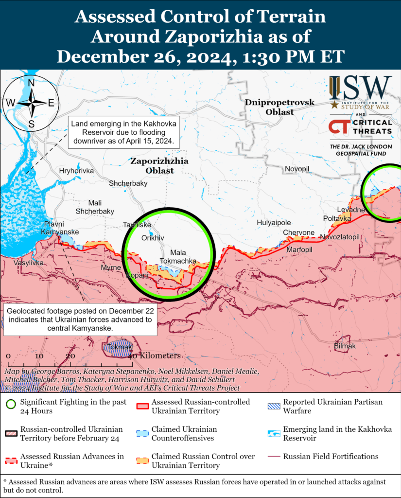 Російські блогери-пропагандисти заявили 25 грудня, що війська РФ нібито просунулися на південь і південний захід від Новоданилівки та поблизу Кам’янського Запорізької області, проте в ISW не знайшли підтвердження цих заяв.