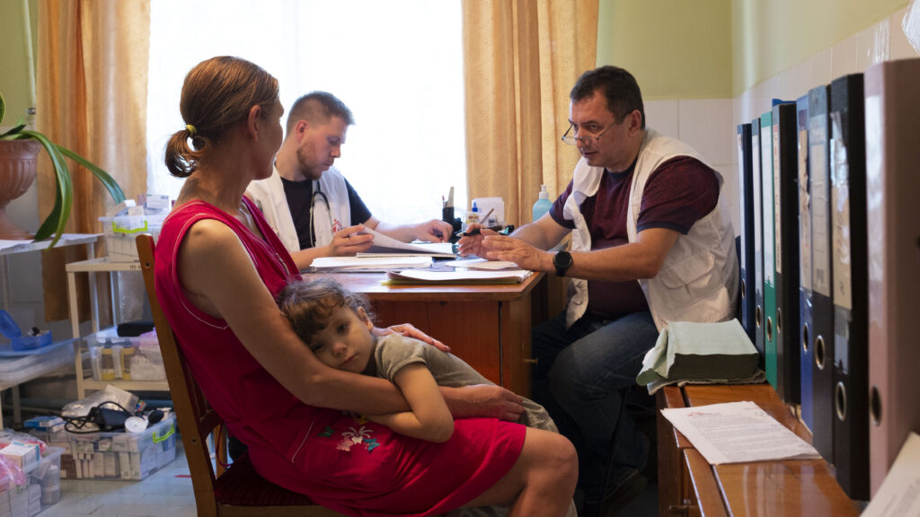 Медбрат Станіслав Крамський (ліворуч) і терапевт Олег Марченко (праворуч) «Лікарів без кордонів» оглядають дівчинку. Вона евакуювалася з мамою і сестрою з міста Оріхова до одного з прихистків Запоріжжя. Скаржиться на кашель і підвищену температуру, довгий час перебувала в підвалі під обстрілами в рідному місті.