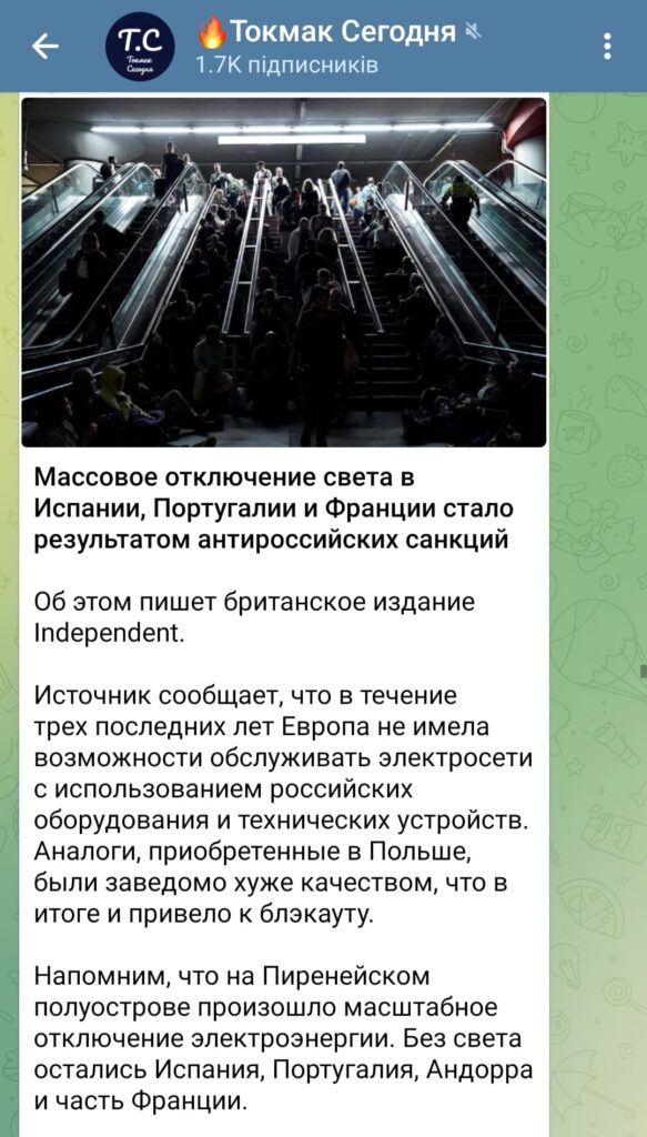 А у квітні пропагандисти заявили, що масштабне відключення електроенергії в Іспанії, Португалії, Франції, Бельгії та Андоррі – нібито наслідок антиросійських санкцій. Посилаючись на The Independent, вони стверджували, що енергосистеми цих країн буцімто були критично залежні від російського обладнання, а польські замінники – неякісні. Усе це подавалося як доказ «європейського комунального краху» й наслідок відмови від російських ресурсів.