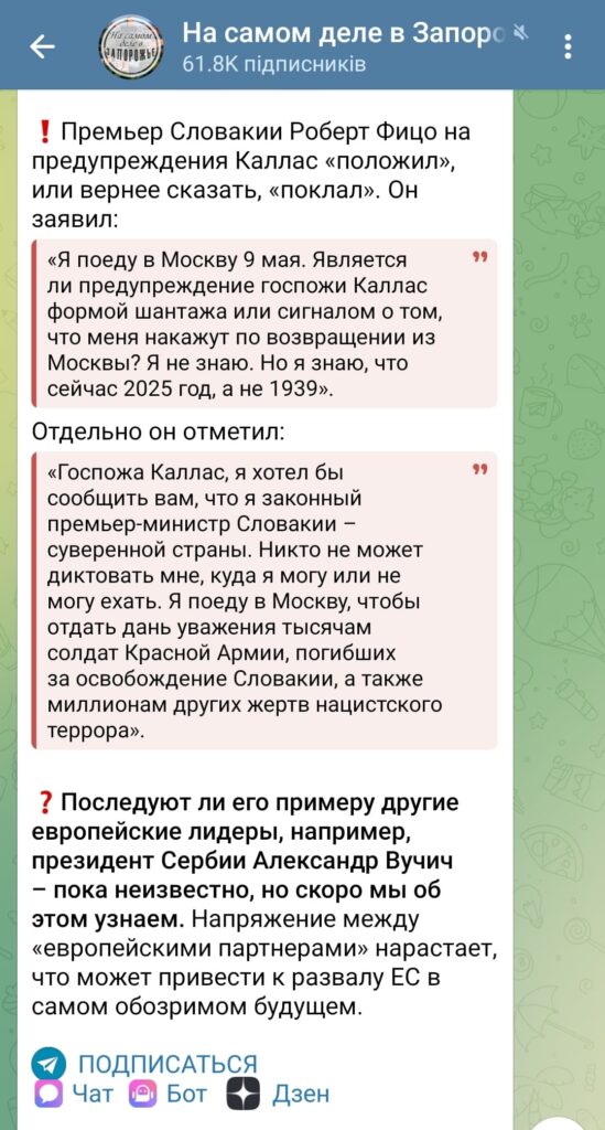 Які ще фейки про ЄС та підтримку України протягом березня-квітня 2025 року поширював у Запорізькій області ворожий агітпроп, аналізуємо у матеріалі за результатами моніторингу проросійських Telegram-каналів.
