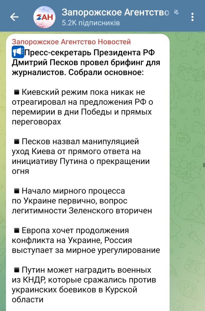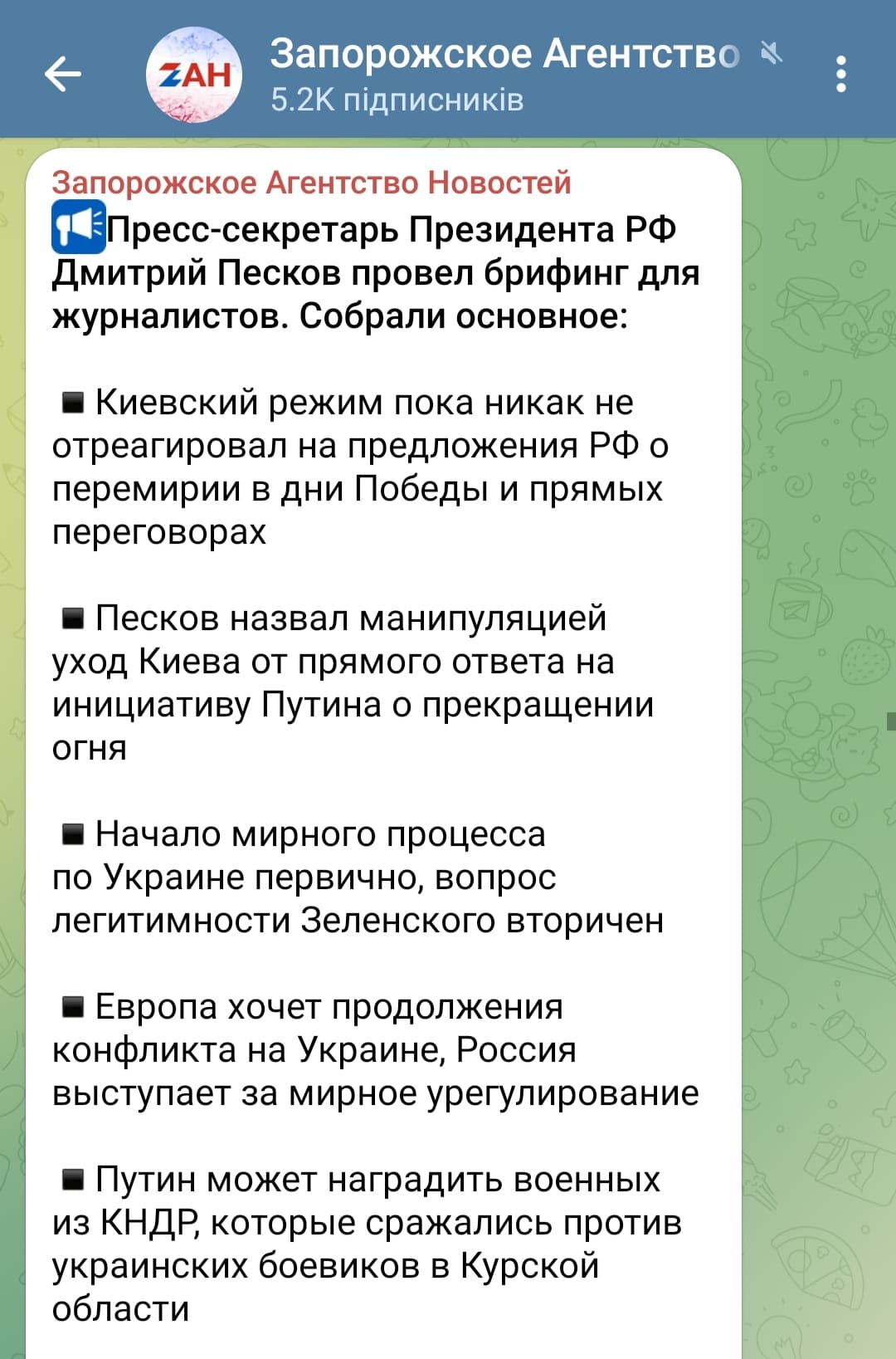 «Пресс-секретарь Президента РФ Дмитрий Песков провел брифинг для журналистов. Собрали главные заявления… Никаких мирных инициатив от Европы не было, европейские лидеры выступают за милитаризацию» (Запорожское Агентство Новостей, 18.04.2025).
