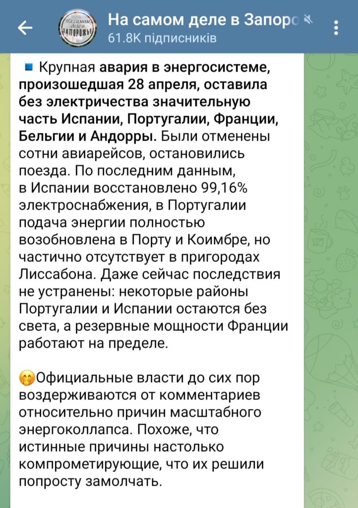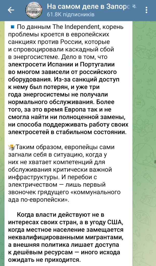 «Крупная авария в энергосистеме, произошедшая 28 апреля, оставила без электричества значительную часть Испании, Португалии, Франции, Бельгии и Андорры… По данным The Independent, корень проблемы кроется в европейских санкциях против России, которые и спровоцировали каскадный сбой в энергосистеме. Дело в том, что электросети Испании и Португалии во многом зависели от российского оборудования. Из-за санкций доступ к нему был потерян, и уже три года энергосистемы не получали нормального обслуживания. Более того, за это время Европа так и не смогла найти ни полноценной замены, ни способа поддерживать работу своих электросетей в стабильном состоянии» (На самом деле в Запорожье, 30.04.2025).
