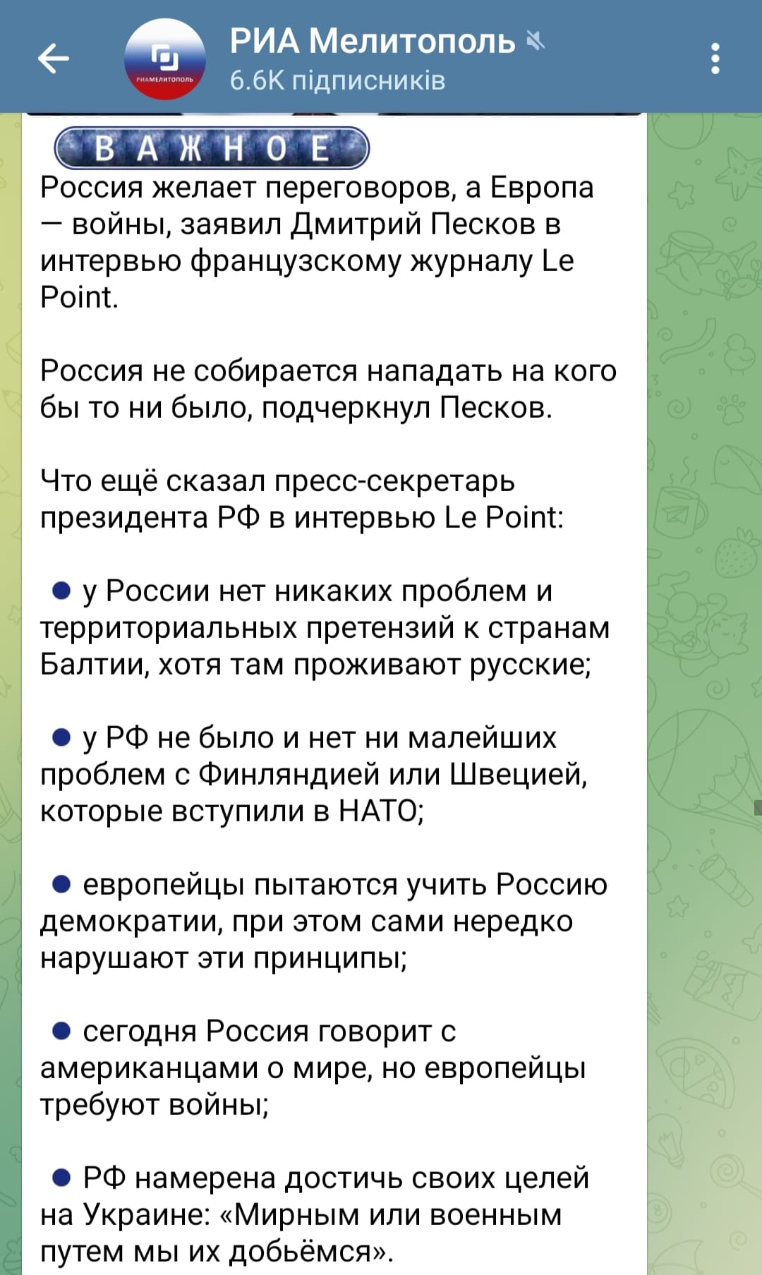 У квітні Telegram-канали цитували речника Кремля Дмитра Пєскова, який стверджував, що Росія нібито прагне миру, а Європа – війни. Він звинуватив європейських лідерів у відсутності мирних ініціатив та підтримці «мілітаризації». В інтерв’ю Le Point Пєсков заявив, що Росія «не має наміру нападати», перекладаючи провину на «ворожий Захід».