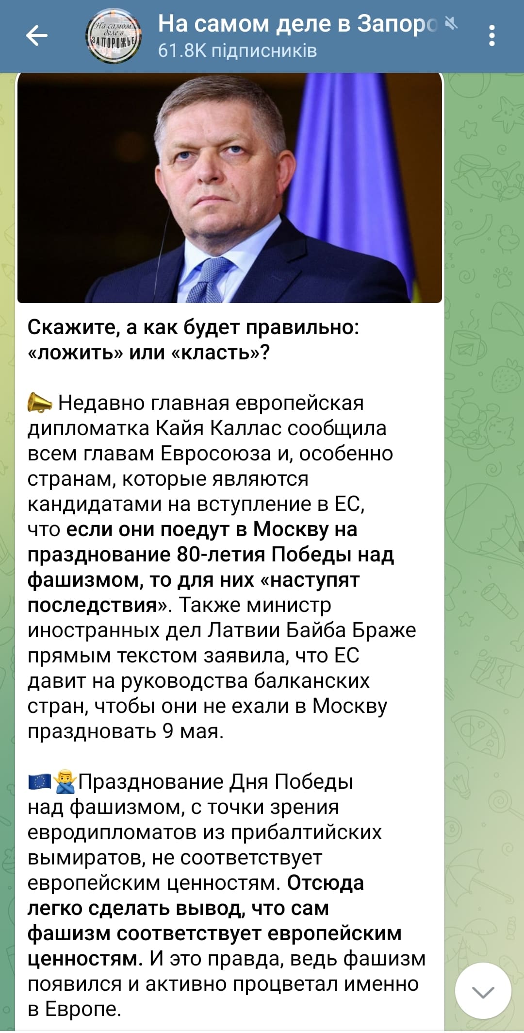 Пропагандисти подають заяву прем’єра Словаччини Роберта Фіцо про поїздку до Москви як виклик Брюсселю й демонстрацію «суверенності». Водночас вони стверджують, що для ЄС святкування перемоги над нацизмом «не відповідає цінностям», отже сам нацизм нібито є частиною цих цінностей. Також пропагандисти заявляють про зростання внутрішніх суперечностей у ЄС, що начебто може призвести до його розпаду.