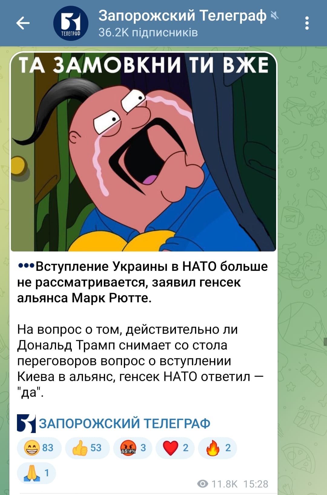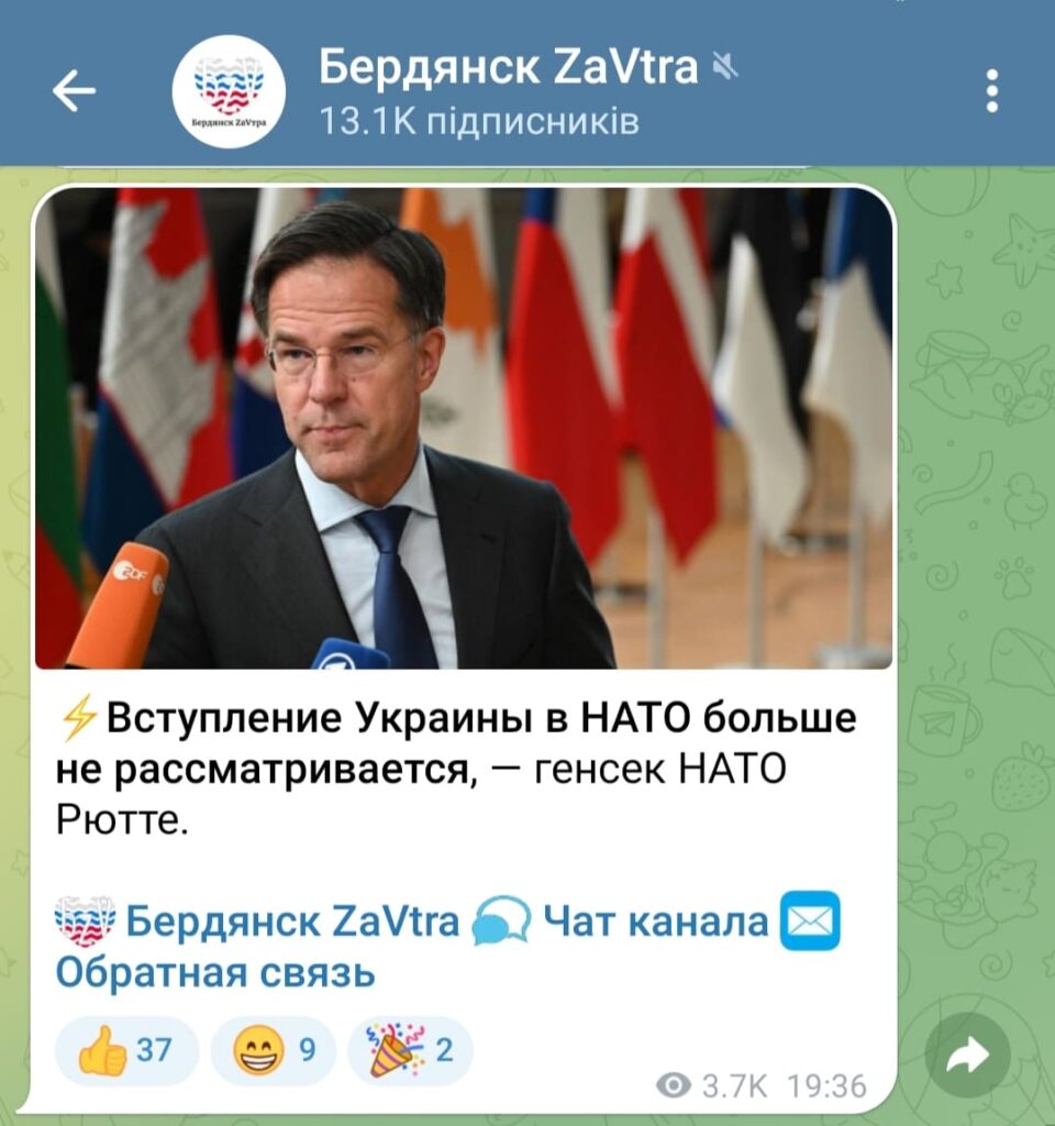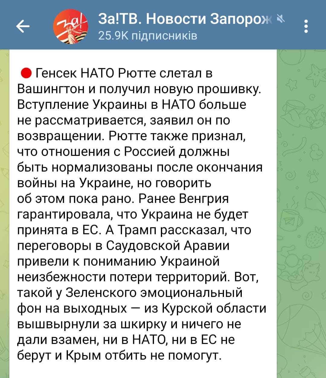 «Вступление Украины в НАТО больше не рассматривается, заявил генсек альянса Марк Рютте. На вопрос о том, действительно ли Дональд Трамп снимает со стола переговоров вопрос о вступлении Киева в альянс, генсек НАТО ответил – “да”» (Запорожский Телеграф, Бердянск.Актуально, Бердянск ZaVtra, Токмак Сегодня, 14.03.2025; Зa!ТВ,15.03.2025).