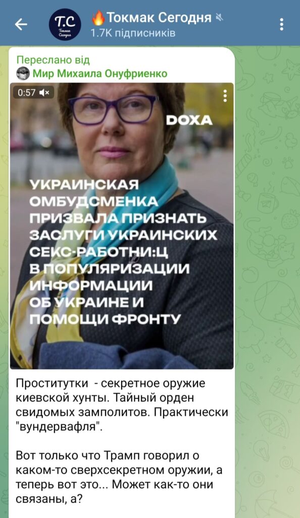 «Перший Запорізький» вже писав у попередніх оглядах, що Кремль систематично дискредитує українок. Поширюючи таку дезінформацію, росіяни закріплюють одну з найповторюваніших тез своєї пропаганди, створюючи образ «неблагонадійної» української жінки, яка, тікаючи від війни, може лише займатися секс-роботою. Цей наратив підтвердили автори дослідження антидезінформаційного проєкту DisinfoChronicle, проаналізувавши 45 тисяч подібних дописів у соцмережах.