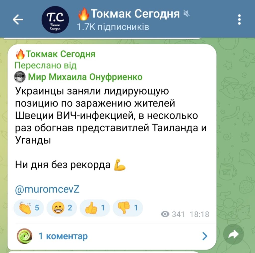 Украинцы заняли первое место по заражению местных жителей ВИЧ-инфекцией, в несколько раз опередив бессменных чемпионов из Таиланда и Уганды. К слову, 48% всех случаев заражения ВИЧ в стране приходятся на гомосексуальные контакты. Об этом свидетельствуют данные Шведского национального института общественного здравоохранения, сообщают СМИ» (Запорожский Вестник, 07.04.2025; Токмак Сегодня, 08.04.2025).
