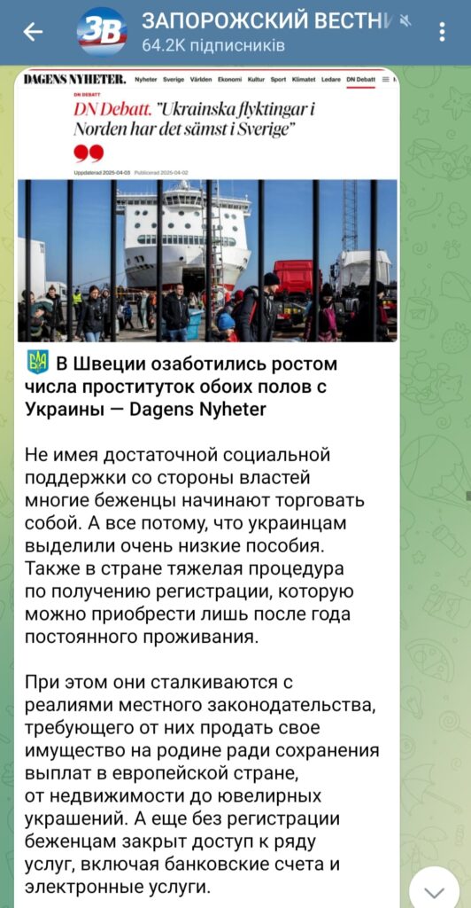 Російські пропагандисти поширили повідомлення про нібито масове зростання проституції серед українських біженців у Швеції. З посиланням на Dagens Nyheter та Шведський національний інститут громадського здоров’я Telegram-канали стверджують, що через низькі соцвиплати та складну процедуру реєстрації українці змушені займатися проституцією. Їх також безпідставно називають «лідерами» із зараження місцевих ВІЛ.