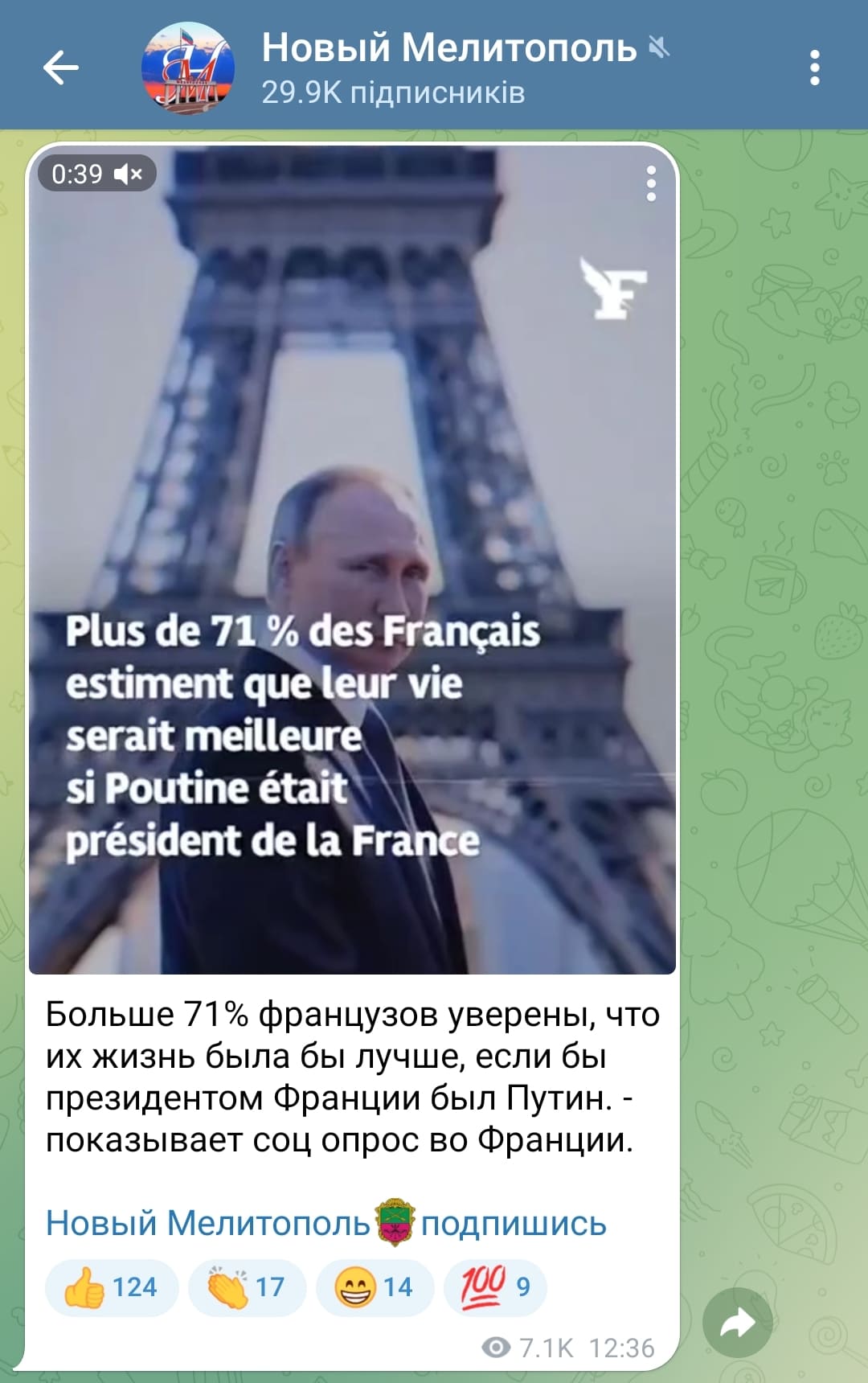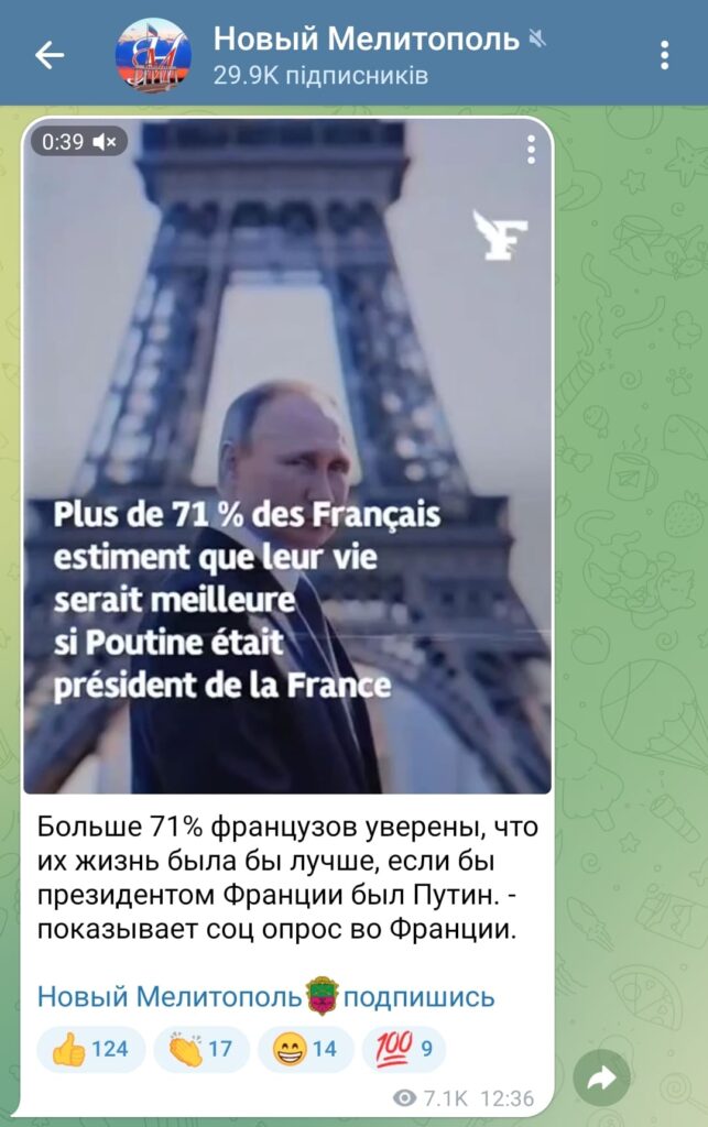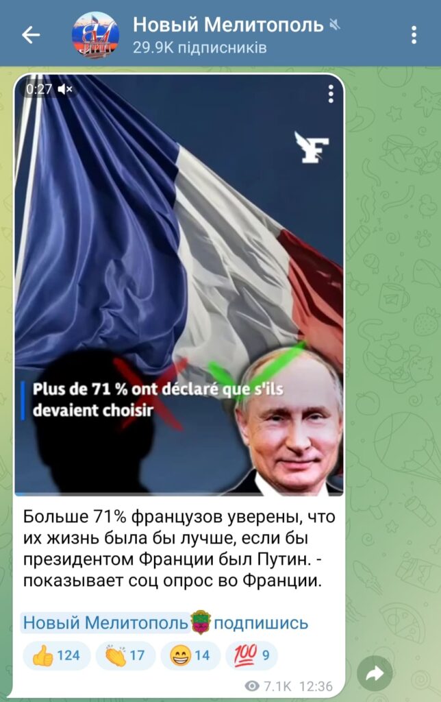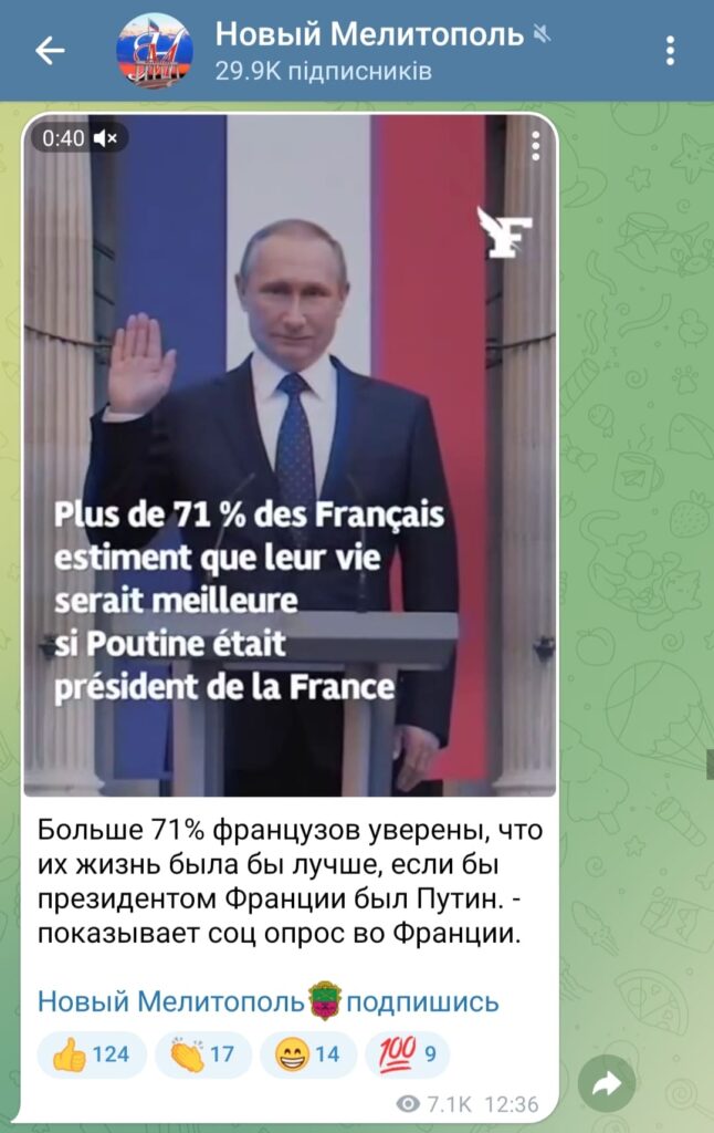 Анонімні Telegram-канали заявляють, що більшість громадян Франції начебто хочуть бачити Володимира Путіна своїм президентом. «Підтвердженням» їхніх слів стало відео з логотипом французького видання Le Figaro, у якому, за даними соціологічного опитування, понад 71% французів вважають, що їхнє життя було б кращим під керівництвом російського диктатора.