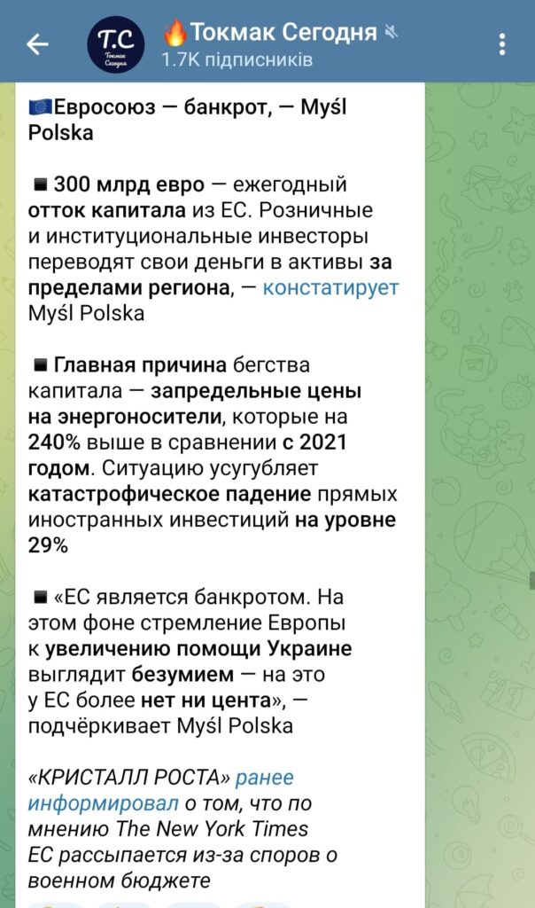 Проросійські ресурси поширили новину про нібито «банкрутство» Євросоюзу. За їхніми словами, з ЄС щороку виводиться 300 мільярдів євро капіталу через високі ціни на енергоносії та падіння іноземних інвестицій. Джерелом назване польське видання Myśl Polska, яке стверджує, що в нових умовах фінансова підтримка України з боку Європи – це «божевілля», оскільки на це «немає жодного цента».