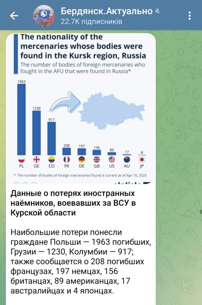 «Данные о потерях иностранных наёмников, воевавших за ВСУ в Курской области. Наибольшие потери понесли граждане Польши – 1963 погибших, Грузии – 1230, Колумбии – 917; также сообщается о 208 погибших французах, 197 немцах, 156 британцах, 89 американцах, 17 австралийцах и 4 японцах» (Бердянск.Актуально, 17.04.2025).
