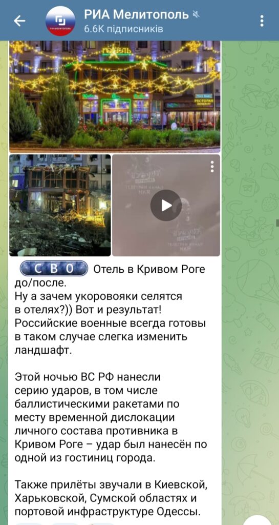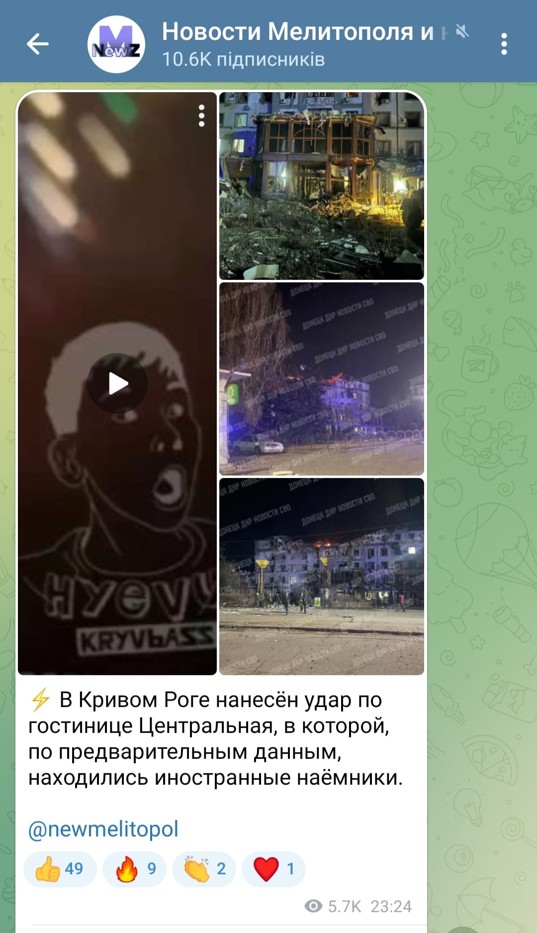 «В Кривом Роге нанесён удар по гостинице Центральная, в которой, по предварительным данным, находились иностранные наёмники» (Новости Мелитополя и не только, РИА Мелитополь, 06.03.2025).