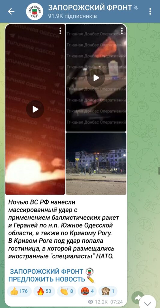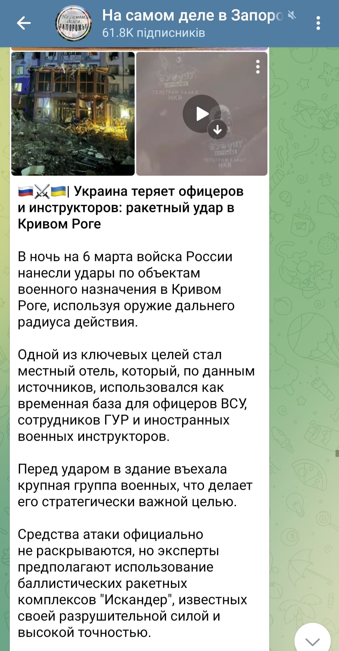 «В Кривом Роге под удар попала гостиница, в которой размещались иностранные “специалисты” НАТО» (Запорожский Фронт, На самом деле в Запорожье, 06.03.2025).