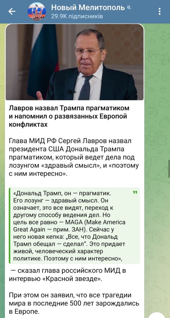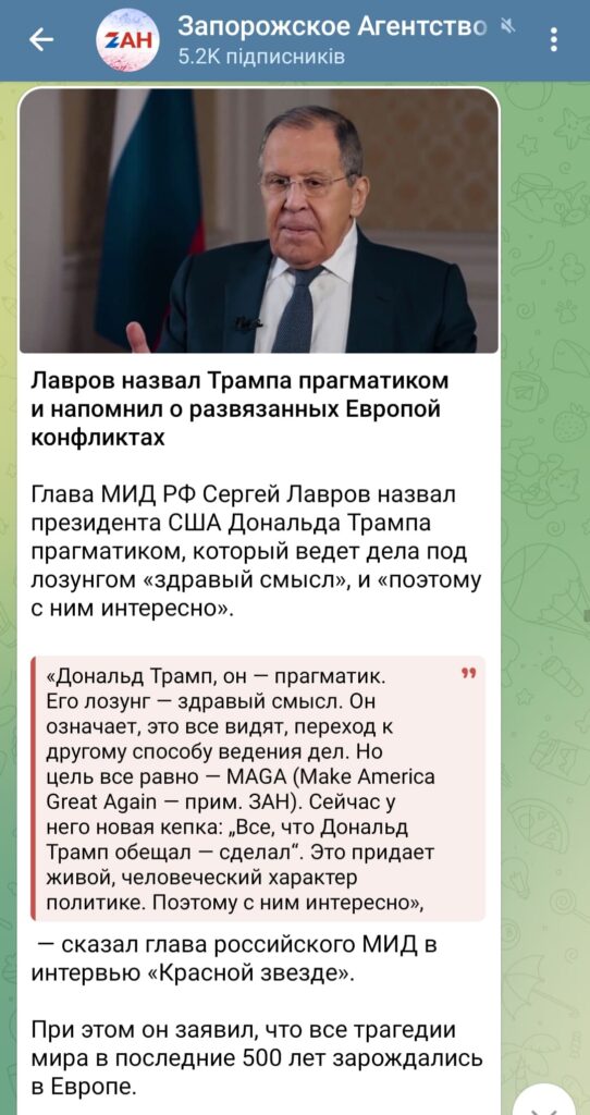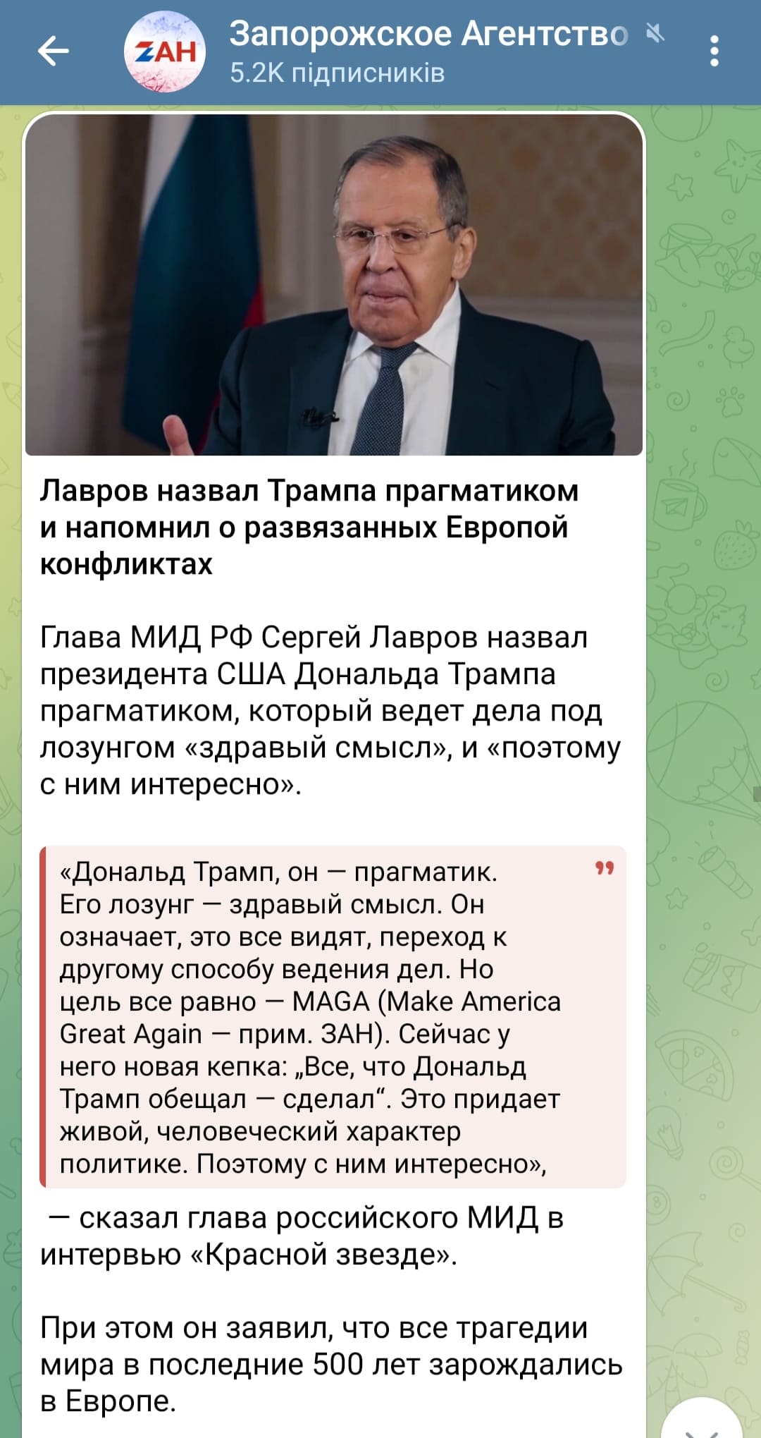 «Все 500 лет все трагедии мира зарождались в Европе или благодаря европейской политике: колонизация, войны, крестоносцы, Крымская война, Наполеон, Первая мировая, Гитлер, и если так посмотреть ретроспективно на историю – американцы не играли такой вот подстрекательской, зажигательской роли» (Токмак Сегодня, Запорожское Агентство Новостей, Новый Мелитополь, 02.03.2025).
