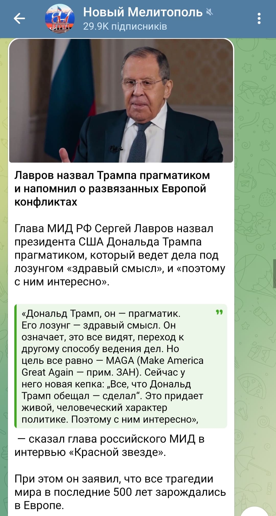 «Европа сделает всё, чтобы не допустить смены режима Зеленского, или найдёт новенького полуфюрера. Все эти миротворческие “схемы”, которые рисуют Макроны и Стармеры, исходят из того, что это требуется, чтобы сохранить хоть кусочек земли, на которой сохранится откровенно нацистский, русофобский режим, заточенный под подготовку очередной войны против России – глава МИД России Сергей Лавров» (РИА Мелитополь, 15.04.2025).