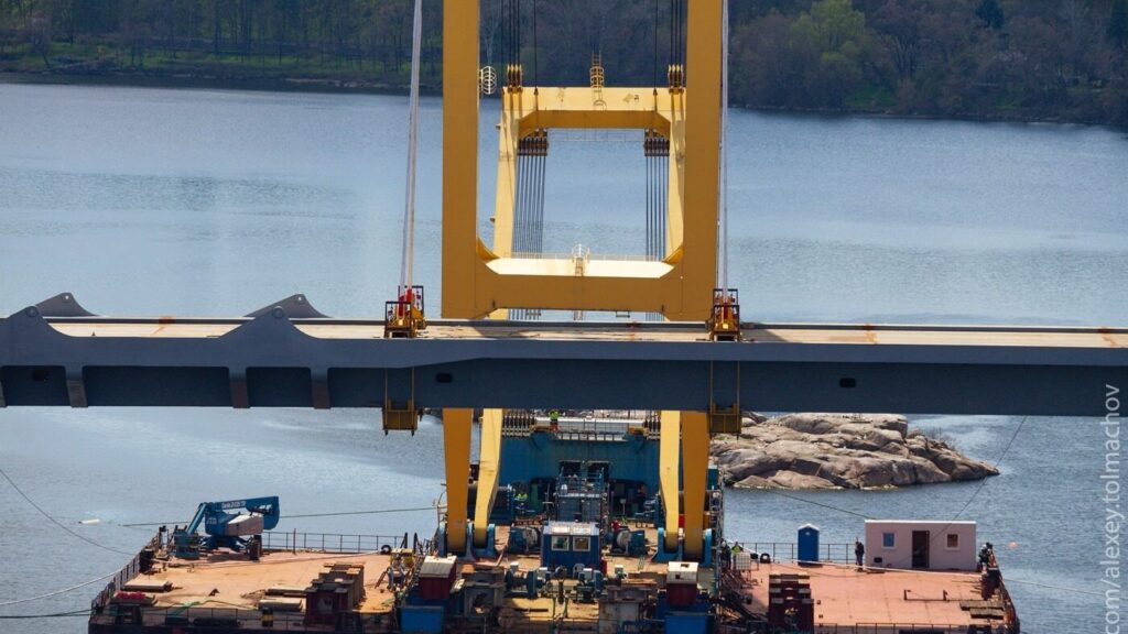 Плавучий кран LK-800 за допомогою чотирьох буксирів транспортував від Кривої бухти до пілонів – до спорудження №10 – величезну конструкцію. Її довжина становить 84 метрів, а вага – 720 тонн. Конструкцію вже опустили на тимчасові опори.