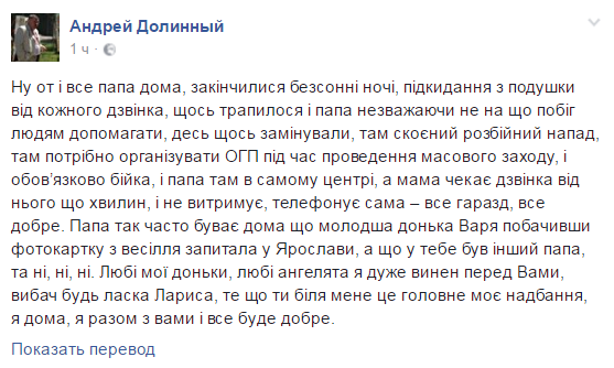 – Ну вот и все, папа дома. Закончились бессонные ночи, вскакивание с подушки от каждого звонка, что-то случилось и папа несмотря не в что побежал людям помогать, где-то заминировали, там совершено разбойное нападение… Дорогие мои дочери, дорогие ангелочки я очень виноват перед Вами, извини пожалуйста Лариса, то, что ты рядом – это главное мое достояние, я дома, я вместе с вами и все будет хорошо, – пишет Андрей Владимирович.