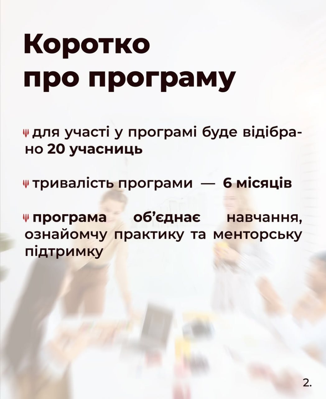 Навіщо створена програма, як вона проходитиме, що робитимуть учасниці, який результат після завершення, хто може податися та як відбувається відбір – деталі на прикріплених інфографіках.